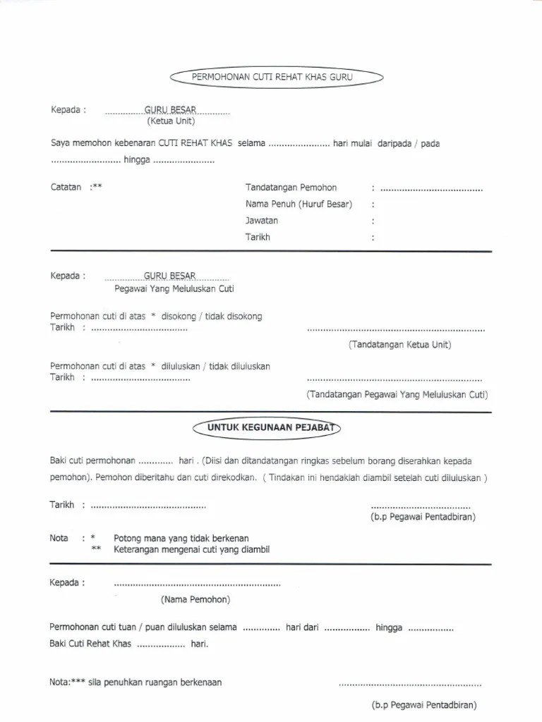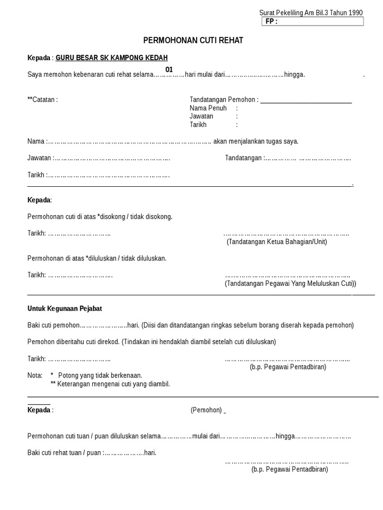 Contoh Borang Cuti Kerja : Borang Cuti Tanpa Rekod Peperiksaan : Ketua jabatan/timbalan ketua jabatan ……pengimejan.. Tajuk kajian 'guna tanah di kawasan kajian anda' telah dipilih sebagai tugasan yang wajib disiapkan oleh setiap calon pt3 pada tahun 2018. Anda cuba buat alasan untuk cuti. Demikian surat permohonan cuti menikah ini saya sampaikan dengan sebenarnya, atas perhatian dan izin dari. 3.1 tips melamar kerja yang baik. Dalam artikel ini, glints telah menyiapkan empat contoh surat cuti kerja, yang terdiri atas cuti tahunan, sakit, melahirkan dan berduka.